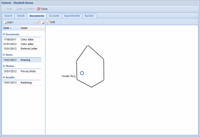 If you have touch enabled device or external touch pad attached to the computer than free hand drawings can be made as part of the patient notes. We believe this interface is invaluable in providing ease access to patient notes in one location.